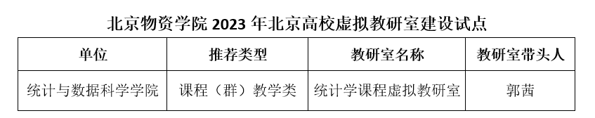 近日,北京市教育委员会公布了北京高校虚拟教研室建设试点名单,经各高校推荐、专家综合评议,共计101个虚拟教研室获批建设试点。公司郭茜教授牵头的“统计学课程虚拟教研室”成功入选,教研室类型为课程(群)教学类。